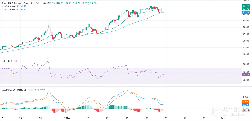 白银在周四有所回升,但缺乏持续上涨的动力,目前在接近历史高位的水平上维持盘整态势,因为风险情绪的适度改善抑制了避险资金的流入。截至撰写本文时,白银价格约为93.90美元,仍低于周二创下的95.89美元的历史最高点。